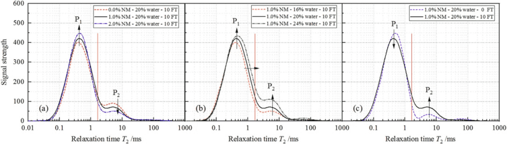 一般來說,如圖4a所示,所有情況下的T2分布都是雙峰的(P1和P2)。它們的弛豫譜以紅色截止線以下的峰值為主,位于0.05和3毫秒之間。從圖中可以看出:隨著NM含量的增加,P1的峰值信號強度增加,而P2的峰值信號強度降低。這說明增加NM可以增加束縛水的部分,同時減少自由水。這可以歸因于納米粒子的表面效應,它導致在水化過程中NM周圍的結合水比例更高。NM的穩定機制可能來自于NM顆粒的吸水效應,它將游離的水變成束縛的水,因此,改善了動態性能,緩解了凍融循環對黃土試樣性能的不利影響。
