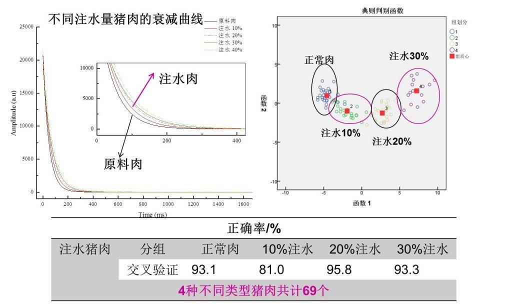 除鑒別注水肉之外,也能鑒別注射黃原膠、卡拉膠、魔芋膠等添加劑的非法豬肉,低場(chǎng)核磁共振的無(wú)損快速的優(yōu)勢(shì)為其應(yīng)用到食品安全的執(zhí)法現(xiàn)場(chǎng)提供了可能。