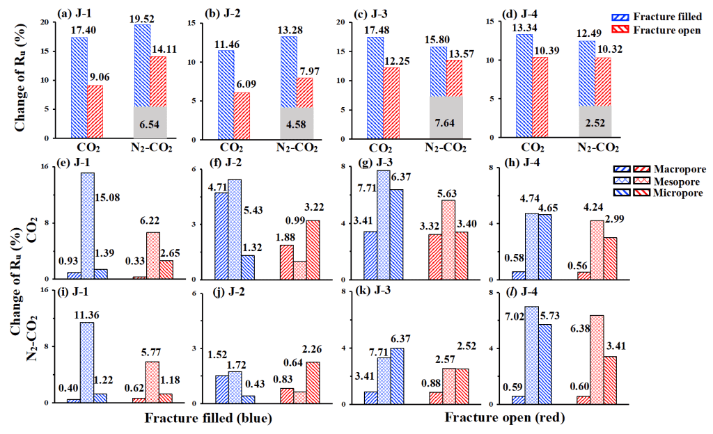 以壓裂前M0采收率為基值,對比裂縫和氣體組合下的增采量Ru(圖6)。基質巖樣M0注N2-CO2效果要好于純CO2(灰色,Dong,2020a)。相比于純CO2吞吐模式,壓裂樣品注N2-CO2在微孔發育巖樣(J-1和J-2)中效果好,但在宏孔發育樣品中效果差(J-3和J-4),推測與N2分子對小孔的彈性支撐作用有關。裂縫會存儲大量氣體,尤其是CO2,削弱氣體在基質孔隙的擴散動能,使得總采出量下降(紅色)。裂縫填充處理可以增大氣體在基質孔隙中的波及效率,增大采收率(藍色)。短期來看,造裂會大幅度提高產量;但縫的儲氣性對長期開發會產生不利影響。