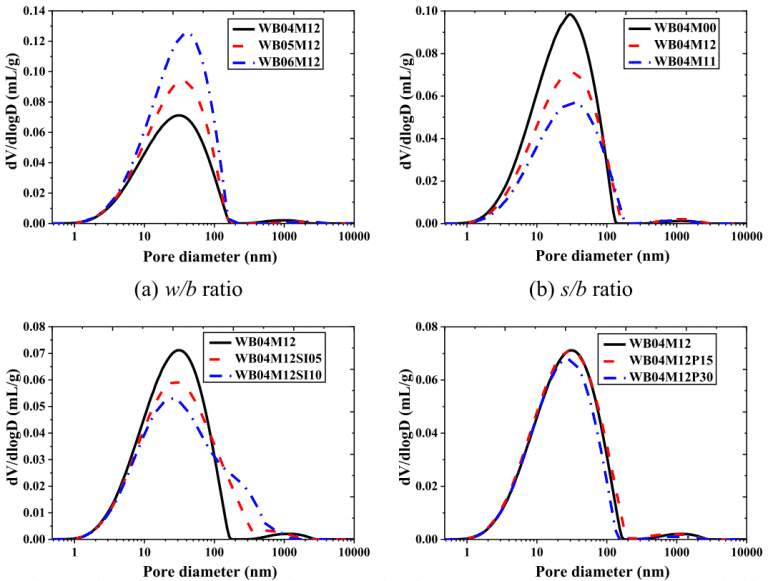 試驗結果顯示,水泥基材料的最可能的孔徑和等效孔徑隨著水灰比(w/c)和粉煤灰(FA)含量的增加而增加,隨著固化時間和水泥與砂比(c/s)的增加而減少。水泥基材料的孔隙率隨著w/c和c/s的增加而增加,隨著固化時間的增加而減少,然后隨著FA含量的增加而增加[2]。