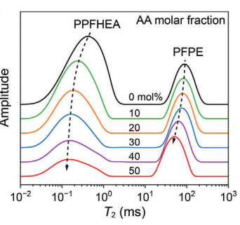 該課題組進一步通過低場19F核磁設備測量了氟化物組分在氟凝膠中的遷移分布情況(圖2),他們此次使用的是蘇州紐邁分析儀器股份有限公司生產的型號為VTMR20-010V-I設備,該儀器可以配置F探頭來檢測F信號。一般來說,T2值越大,對應物種的流動性越高。在該體系中,較短弛豫時間的T2峰源于PPFHEA的氟化側鏈,而較長弛豫時間的的T2峰則歸因于PFPE。隨著AA含量的增加,兩個T2峰都向較低的弛豫時間移動,這表明PPFHEA/PFPE潤滑相內聚合物鏈的流動性逐漸受到限制。此外,他們對核磁信號進行反演后,擬合出體系內自由鏈、懸掛鏈和交聯鏈的比例(圖3)。在純PPFHEA中,懸掛鏈的比例為39%,而在氟凝膠中,該比例顯著降低。當AA含量增至50 mol%時,交聯鏈的比例則呈相反的趨勢。這些發現清楚地表明,隨著AA含量的增加,通過形成額外的氫鍵,交聯密度顯著提高。