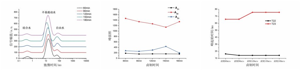鹵制初期(60-90min):高溫破壞蛋白質結構,水分由肌原纖維細胞內部向外部遷移,不易流動水減少,自由水增加,高溫促使肌肉纖維收縮,對細胞內水的束縛力增強,T22運動性降低,而肌肉蛋白網絡結構破壞,持水力降低,T23運動性增強;高溫迫使部分結合水脫離蛋白質,含量減少;