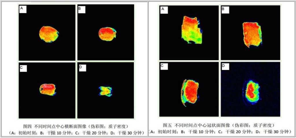 1.核磁共振成像中(圖四和圖五),顏色代表信號強度,紅色信號越大,氫質(zhì)子密度越大,藍色信號越大,氫質(zhì)子密度越小,通過核磁共振成像可明顯看出不同干燥時段水分的分布及變化;