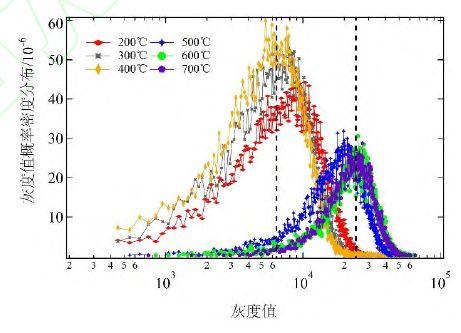 上圖為不同溫度花崗巖試樣像素值的概率密度函數分布圖,所有對應溫度下的成像分布遵循對數正態分布。隨溫度升高,曲線向右大幅度移動,較大像素值增加,巖石內部損傷加劇,概率密度峰值所對應的像素值增大并向右轉移,像素分布遷移規律與T2譜圖分布變化特征一致,能定量表示花崗巖在高溫作用下內部結構損傷過程。