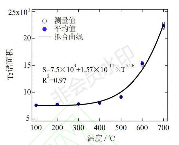 利用T2譜面積來評價溫度作用下巖石損傷程度,從上圖可以看出,T2譜面積在低于400℃時,隨溫度的升高,譜面積并未發生明顯改變,當溫度高于500℃時,譜面積急劇增大,整體譜面積與溫度呈現冪函數形式的增加。