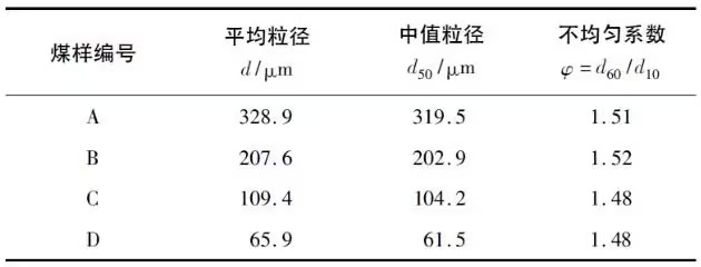 試驗選用煤粉作為原材料,經50、70、100、200、270目篩網篩分得到樣品,然后經水洗篩分,烘干后得到顆粒粒徑相對單一的A、B、C、D四種煤粉,各自的顆粒粒徑分布見圖1,顆粒粒徑及不均勻系數見圖2。