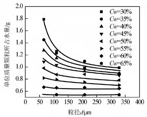 圖6b為不同濃度下粒徑與自由水量的關系,可以看出,當濃度小于55%時,顆粒粒徑越大,單位質量顆粒所含的自由水量越多;當濃度大于55%時,自由水量變化不大,接近于0;這是由于顆粒粒徑越小,其吸附能力和團聚作用也就越強,更多的水分以間隙水和吸附水的狀態存在。