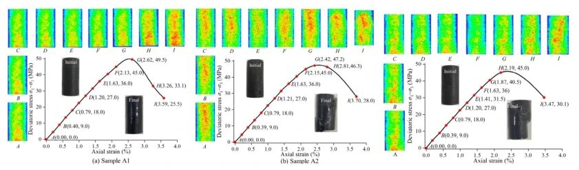 圖一三個樣品峰值強度分別為49.5、47.2和45MPa,最大應變分別為3.59%、3.7%和3.47%。核磁成像表征了樣品在加載過程中含水量的空間分布,暖色程度越高水含量越高。