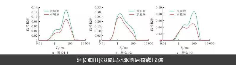 由研究區長8儲層巖心樣品驅替前后核磁共振T2譜可以看出,在水驅油實驗過程中,油量的減少使得油相弛豫信號逐漸減弱,T2譜左、右峰幅度均減小,但右峰幅度減小更明顯,表明注入水主要驅替的是一些大孔隙和中孔隙中的原油。同時殘余油弛豫時間小于100 ms,且峰值較高,說明水驅油實驗過程中主要驅替大孔隙中的原油,而殘余油主要存在于中一小孔隙,大孔隙中分布較少。