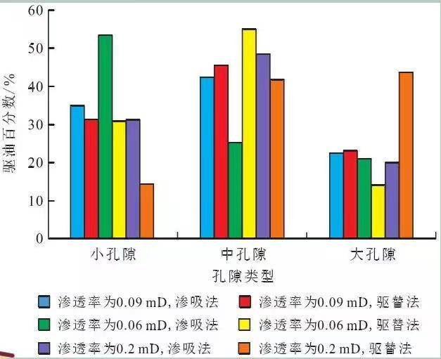 定義不同類型孔隙出油量與總出油量的比值為驅油百分數。根據弛豫時間與孔隙半徑的關系,可以將水驅油前后和滲吸前后核磁共振T,譜轉換為孔隙半徑,進而計算出驅油百分數,見下圖。