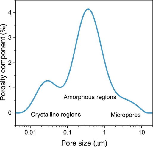 0.09 ms的超短T2時間歸屬于木質纖維素的質子弛豫。兩個較短的T2時間(2 ms和40 ms)分別歸因于納米級狹縫內的水,它們分別與纖維素的晶體區和非晶區相關。長T2時間(600 ms)歸屬于微米級木質部導管內的水。上述結果通過孔徑分布分析進一步得到證實。非晶區水的T2振幅遠高于其他區域,表明水主要集中在木質部導管壁內纖維的非晶區。同時,木質部導管僅含極少量的水,表明這些導管內存在大量的空洞。
