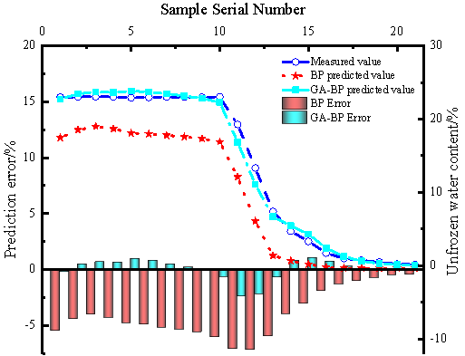 本文中,原始訓練樣本被隨機劃分為三組:訓練樣本、測試樣本和驗證樣本。首先,利用原始訓練樣本對網絡進行訓練,以實現最佳初始權重和閾值。通過解碼將初始權重、閾值及優化值分配給神經網絡,訓練后獲得網絡訓練誤差曲線。然后,利用優化后的網絡對凍土訓練樣本的未凍水含量進行預測,并通過對比預測值與實際值來評估網絡的擬合效果。本文采用未優化的BP神經網絡作為對照組,預測結果如圖4所示。相較于BP神經網絡,遺傳算法優化的BP神經網絡(GA-BP神經網絡)的預測誤差更小,變化更穩定,表明其擬合值更接近訓練樣本的擬合值。此外,GA-BP神經網絡的收斂速度比BP神經網絡更快,能夠準確預測測試樣本的輸出值,從而實現未凍水含量的GA-BP神經網絡預測模型。