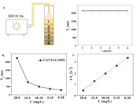 通過光還原過程,高毒性的Cr(VI)可以在TiO?2、ZnO、CdS和MoF等光催化劑上還原為低毒的Cr(III),這可以被視為一種簡單、清潔和方便的策略。通常認為溶液中鉻的光還原是一個均勻過程。然而,在真實的宏觀反應系統中,光還原過程中經常發生沉淀和分層。因此,反應系統中的光還原過程比均相反應系統中的光還原過程更加復雜。深入了解不同深度反應系統中的光還原過程,可以極大地促進高性能光催化劑的設計。如何在不同深度上監測反應系統中的光還原過程引起了該領域的許多研究興趣,低場核磁共振技術在這一過程中展示了極大的應用潛力。