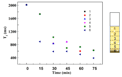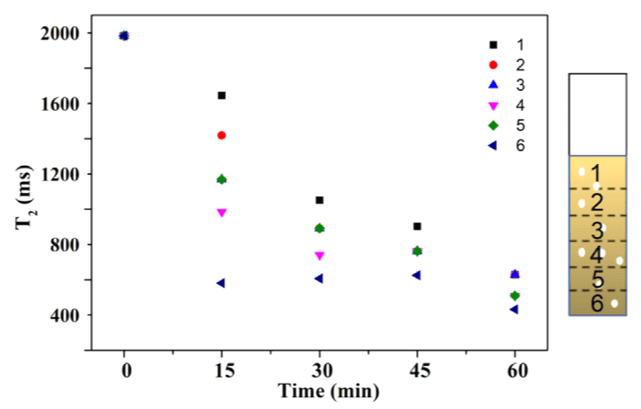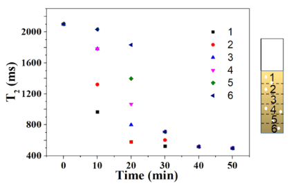 圖2 根據照明時間繪制樣品不同層的橫向弛豫時間(T 2)。實驗中使用了Pt/CN光催化劑。實驗條件:光催化劑重量?5 mg,六價鉻濃度?20 mg/L,全波段光照射。