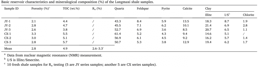 從目標地層收集六個頁巖樣品。提前采用紅外(NDIR)檢測法, TOC-L分析法、X射線衍射法(XRD)、自動數字巖石巖相分析儀等各類方法和儀器以調查其巖石物理特征和礦物學組成。結果如下: